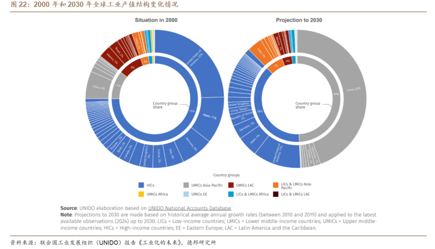 一是因地制宜发展新质生产力将助力我国制造业全球占比再创新高。党的二十届四中全会公报明确提出,要坚持把发展经济的着力点放在实体经济上,保持制造业合理比重,构建以先进制造业为骨干的现代化产业体系。展望“十五五”时期,我们认为我国由“制造大国”向“制造强国”转型的趋势有望延续并进入决胜阶段,传统产业改造升级、新兴产业培育壮大、未来产业前瞻布局均将取得标志性进展,我国企业在全球产业链、供应链、价值链中的位势将获得进一步提升,并将在激烈的国际竞争中赢得战略主动,制造业在全球中的占比有望再创新高。2024年12月,联合国工业发展组织(UNIDO)发布的研究报告《工业化的未来》中便指出,中国在2000年仅占全球工业总产值的6%,2024年该比例已升至31.6%,预计到2030年该比例有望进一步跃升至45%,同期美、日、德三国占比将分别萎缩至11%、5%和3%,我国制造业的规模优势将进一步扩大。