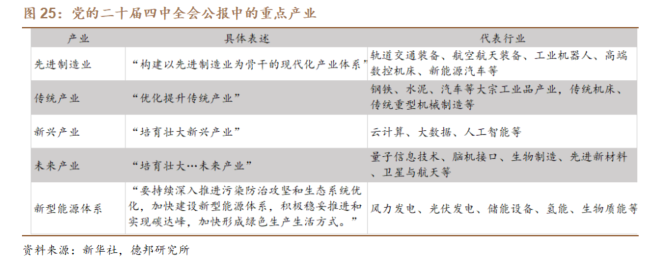 一是回顾历次规划建议可以发现,对“产业”、“制造业”、“实体经济”的重视程度正逐步增强。在“十三五”规划建议中,明确提出“加快建设制造强国,实施《中国制造二〇二五》”,以及目标要求“产业迈向中高端水平,先进制造业加快发展”;但“实体经济”更多出现在成本控制等细节中,并未成为核心表述。进入“十四五”,文件首次强调“坚持把发展经济着力点放在实体经济上,坚定不移建设制造强国、质量强国、网络强国、数字中国,推进产业基础高级化、产业链现代化”;进一步提出“保持制造业比重基本稳定,巩固壮大实体经济根基”。相比之下,“十五五”规划建议(即二十大四中全会文件)在产业方面措辞更为突出,要求“建设现代化产业体系,巩固壮大实体经济根基。坚持把发展经济的着力点放在实体经济上,坚持智能化、绿色化、融合化方向,加快建设制造强国、质量强国、航天强国、交通强国、网络强国,保持制造业合理比重,构建以先进制造业为骨干的现代化产业体系。要优化提升传统产业,培育壮大新兴产业和未来产业,促进服务业优质高效发展,构建现代化基础设施体系”。由此可见,“十五五”规划建议在政策表述中更加强调制造业和实体经济的重要性,上升到构建先进制造业为骨干的现代化产业体系的高度,体现了对产业发展的更高关注度和更强政策导向。
