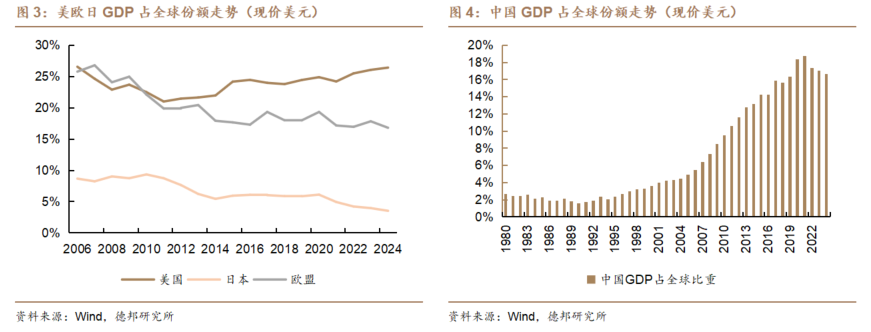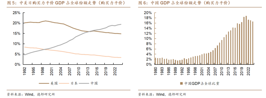 若从购买力平价角度看,可以得出更明显的结论。早在1999年,中国按购买力平价计算的全球GDP占比已经超过日本,份额连续三十多年保持稳步增长,中间鲜有回落,并在2014年超越了美国,位列全球第一。按2024年购买力平价GDP数据,中国19.3%的全球占比较美国的14.8%已有显著优势,而日本仅剩3.2%的水平。按此计算,中美位列全球经济前两名且遥遥领先其他经济体。