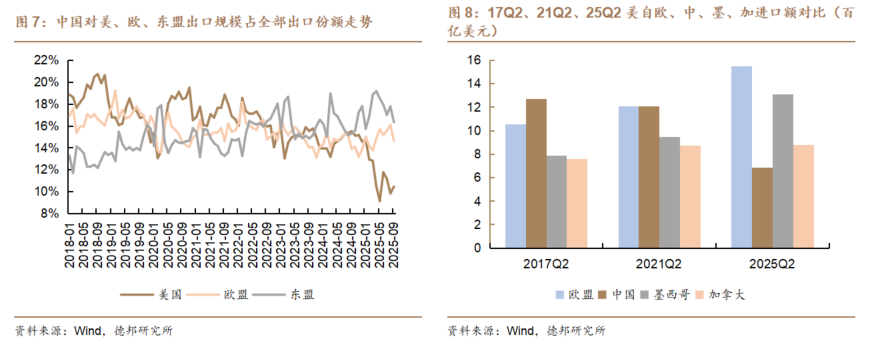 一是中美继续维持“高集中度”经济地位并保持“有限挂钩”的经贸合作。无论是从现价美元还是购买力平价计算的GDP来看,中美“高集中度”的经济地位毋庸置疑。但在中美之间,过往紧密的经贸联系在2018年开始出现松动,并经历了疫情后的波折,随着特朗普再次入主白宫后开启的“关税大战”,2025年双方经贸关系出现裂痕,近6个月中美之间的直接贸易规模均以两位数增速下滑,直接导致中国对美出口占全部出口的比重从15-20%的区间回落至10%附近,美国不再是中国最大的出口对象,而是排在东盟与欧盟之后。从美国进口视角同样能够看到类似结论,对比2017年、2021年及2025年第二季度的美国进口数据,可以看到中国从美国最大的商品来源国逐步落后于欧盟、墨西哥与加拿大。虽然中美直接贸易规模和相互之间的重要性出现下滑,但由于双方在稀土、大豆等领域的互相依赖度较高,中美在4月关税战后开启了多轮谈判,并在近期计划进行新一轮谈判,预计未来中美在经贸领域的合作将是有限度挂钩的状态。