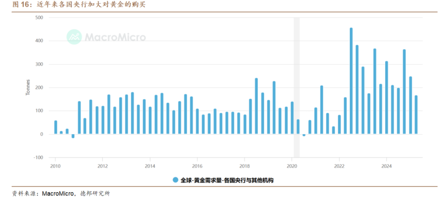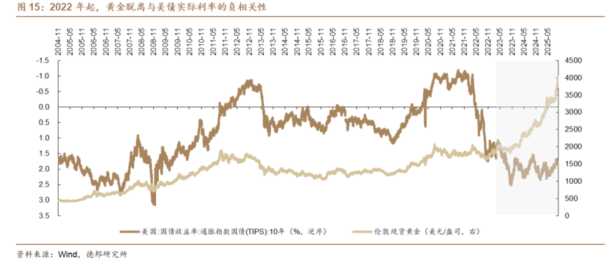 “去美元化”开始真正被市场重视是在2022年。随着美债规模的不断增加,美国财政利息支出负担愈发沉重,2021年大通胀后美债利率快速上升,进一步加重了美国财政的压力,世界对美债信用的“信仰”开始动摇,以美债为锚的美元货币体系开始出现裂痕。正是从2022年起,黄金开始脱离与美债实际利率的负相关性,开启了大周期的上行。2023年麦卡锡被罢免事件、2025年特朗普上台后爆发的关税风波更是进一步加速了“去美元化”进程。