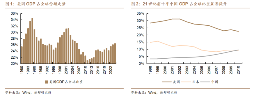 随后2007年次贷危机和衍生出的2008年经济危机接连爆发,美国GDP占比继续小幅回落,在21世纪第一个十年维持稳健的欧盟受到2011-2013年欧债危机的牵绊,日本也在经历失去 “三十年”的下半场。中国经济依然保持强劲增长,金融危机后的十年再次实现全球经济份额的翻番,将2008年7.4%的份额提升至2017年的15.9%,并在疫情后的2021年创造了18.8%的阶段新高。按2024年各国占全球GDP份额看,中国已经和欧盟平分秋色,距离美国也不太遥远。从单个国家的角度看,中美已然成为了全球经济的TOP2。