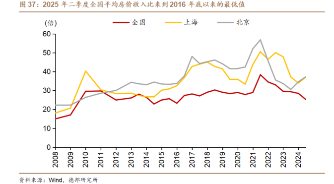 一线城市的房价收入比虽仍高于中小城市,但也出现了显著下降的迹象。例如,北京、上海等一线城市在2021、2022年的房价收入比高达50倍左右,而最新数据显示,北京和上海也降至37倍左右的水平。随着近几年一线城市房价回落,叠加居民收入持续增长,其房价收入比已从峰值回落并趋于理性。我们预计,这一下行趋势在“十五五”期间仍将延续——房价收入比将继续受到收入等基本面因素的制约,从而进一步巩固住房“以居住为本”的属性。