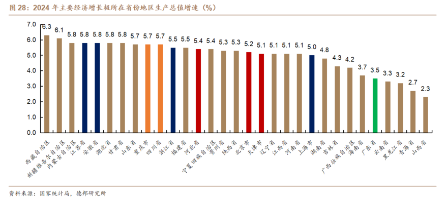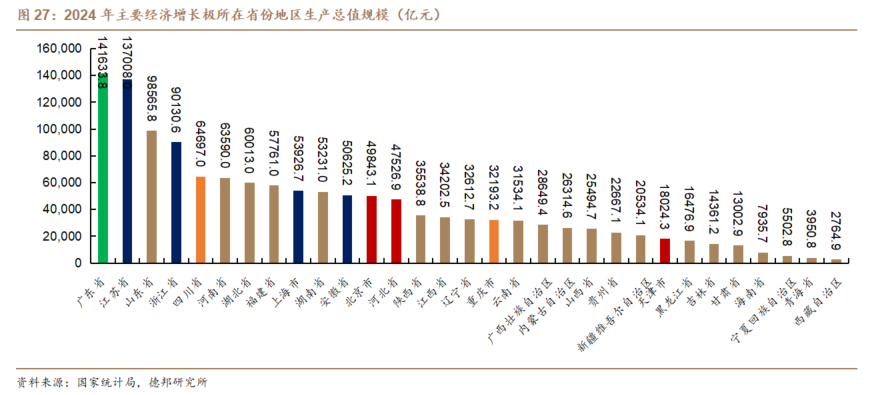 多个经济增长极积势成型并对全国经济形成有效支撑。我国国土空间广阔、经济体量庞大,单一“雁头”带动模式易引发诸多弊端,培育多个增长极并推进协同发展,才能产生更强的规模效应和集聚效应,推动全国经济实现持续健康发展。2024年长三角(上海、江苏、浙江、安徽)GDP合计33.17万亿元,全国占比24.7%;粤港澳大湾区(仅广东)GDP达14.16万亿元,全国占比10.6%;京津冀(北京、天津、河北)GDP达11.54万亿元,全国占比8.6%;成渝(四川、重庆)GDP达9.69万亿元,全国占比7.2%。上述四大经济增长极GDP全国占比高达51.2%,成为支撑我国经济增长的关键力量,并对周边地区和省份的经济社会发展形成显著辐射带动。