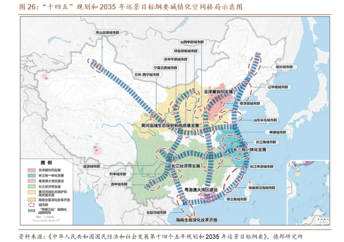 趋势六:区域发展格局从“雁阵模式”到“多核协同”。国家将加力支持主要经济增长极发展并更好发挥其辐射带动作用,京津冀、长三角、粤港澳大湾区、成渝等主要经济增长极地区生产总值占全国的比重有望在现有51.2%的基础上,进一步上升至53%左右,与此同时“硬联通”与“软连接”的逐步完善将助力“多核”之间深化协同。