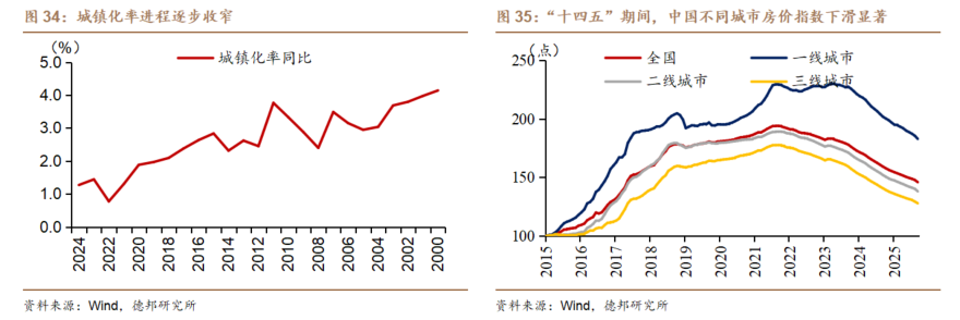 进入2024年后,全国新生人口出现反弹,全年出生约954万,较上年略有回升,出生率提升至6.77‰,为近三年来首次小幅上升。多地数据显示,出生人口降速放缓,部分地区已出现回稳迹象。自“全面三孩”政策实施以来,国家和地方密集出台配套政策,包括育儿补贴、个税抵扣、教育减负、托育体系建设和女性就业支持等,生育环境正持续改善。这些政策使生育意愿在边际上回暖,我们判断出生人口的这一快速下滑阶段在“十五五”时期将告一段落。