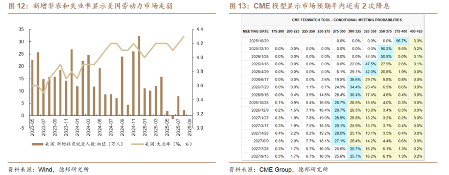 另一方面,美联储的政策转向成为美元走弱的直接推动力。2025年9月,美联储在就业增速放缓的背景下再度开启降息,虽然鲍威尔的讲话偏鹰,更加强调就业与通胀间的平衡,并未释放连续降息的信号,但市场目前仍预期年内还有2次降息。从货币传导机制看,降息意味着美元收益率优势下降。过去几年美元走强的重要支撑之一正是美债利率吸引全球资本流入美元资产,随着利差收窄,投资者可能会重新评估美元资产的风险收益比。