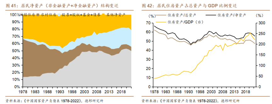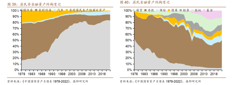 一是随着地产步入下行周期,“去地产化”也在催生“负财富效应”,未来居民财富增值的“新解”或许在以股票、债券和基金为代表的金融资产。2019年以来,居民住房资产的相对规模有所缩水,其占GDP、居民总资产、居民净资产的比例均出现下行。截至2022年,三者较2019年高点分别回落19.0、3.7、3.4个百分点。与此同时,非金融资产占比的下降对应着金融资产占比的上升。在金融资产内部,截至2022年,如果考虑股票、股权、债券和基金四类资产,相比2019年而言,我们发现它们在总资产中的占比也有所下行。然而,考虑到居民部门的“股权”资产主要对应于非上市公司净资产的私人部分,因此高度集中于少数投资人或企业主手中,如果予以剔除,将股票、债券和基金这三类普通投资者容易接触到的金融资产合并考虑,可以发现它们在总资产中的比重有所提升,2022年占比为14.1%。虽然从绝对数值上看,这几类金融资产在居民总资产的占比还远远比不上住房资产,但其未来的成长空间无疑是巨大的。