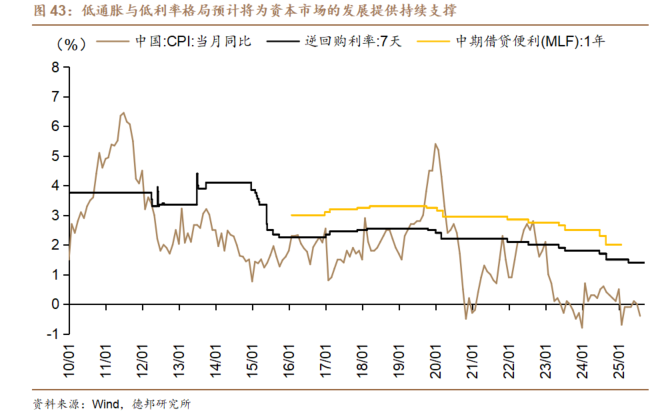 二是从宏观层面看,低通胀、低利率与流动性合理充裕的金融环境预计成为支撑这一趋势的重要基础。我们认为,“十五五”时期,中国经济运行的主要特征之一,将是物价温和、利率低位、流动性充裕的中长期金融格局。通胀水平预计将维持在合理区间内,既不会形成系统性通胀压力,也不至于陷入通缩区间,为政策调控留出充足的空间。温和的通胀意味着居民储蓄的实际回报有限,从而弱化传统存款的吸引力,使得家庭资产配置的重点逐步从“保值”转向“增值”。与此同时,货币环境预计将维持中性偏松,即在稳健基调下保持对实体经济和资本市场的合理支持。政策层面,央行更可能通过结构性工具与市场化利率机制,维持资金面的合理宽松,以促进投资和消费修复。低利率结构不仅降低了企业融资成本,提升了投资回报的可预期性,也在估值端抬升了资本市场的相对吸引力。当无风险利率长期处于低位时,资产定价体系的重心自然上移,权益类资产与长期投资品种(如REITs、养老金产品等)在居民配置中的比重将逐步上升。