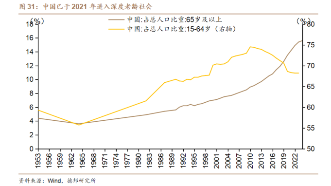 从“十四五”时期看,中国人口出现了历史性拐点。虽然在全面二孩政策实施初期(2016—2017年),我国出生人口出现过短暂抬升,一度超过1700万,但随后生育意愿持续下滑、育龄女性减少、婚育推迟明显,人口出生规模开始下降。中国自2021年正式进入深度老龄化社会,到了2023年,全国出生人口降至902万,较2016年几乎减半,创历史新低。随着“60后”、“70后”群体陆续步入退休高峰期,65岁及以上人口占比将在“十五五”期间将继续上升;劳动年龄人口(15-64岁)占比则持续下降,劳动力供给约束日益突出。这一变化既会抬升用工成本、压低潜在经济增速,也将推动资本与技术投入回报上升,促进产业自动化与智能化转型,从而孕育新的生产率红利。与此同时,老龄化社会的到来也催生了庞大的“银发经济”,老年群体消费结构从基本保障型向品质提升转变,带动医疗健康、长期护理、康养地产、文旅休闲、养老金融等产业快速成长,成为新的增长动能。