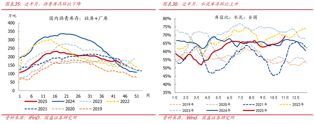 沥青库存下降、水泥库容比上升。近半月,沥青库存(厂库+社库)环比降8.8%,同比增12.0%。水泥库容比均值环比上升2.7个百分点至68.0%,相比2024年同期偏高1.3个百分点。