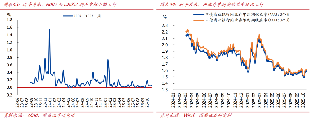 >汇率&海外市场:由于鲍威尔在10月议息会议上态度偏鹰,近半月美元指数上涨,均值环比回升0.3%、收于99.731;人民币小幅升值,美元兑人民币(央行中间价)均值下跌0.2%。截至10月31日,10年期美债收益率较两周前上行9.0bp、收于4.11%,主因美国国债本金支付“展期”消息加重了市场对美国财政的担忧;中美利差(中国-美国)倒挂幅度扩大11.3bp、收于231.6bp。