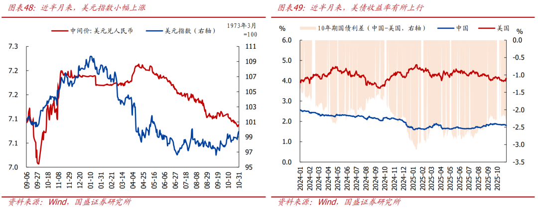由于鲍威尔在10月议息会议上态度偏鹰,近半月美元指数上涨,均值环比回升0.3%、收于99.731;人民币小幅升值,美元兑人民币(央行中间价)均值下跌0.2%。截至10月31日,10年期美债收益率较两周前上行9.0bp、收于4.11%,主因美国国债本金支付“展期”消息加重了市场对美国财政的担忧;中美利差(中国-美国)倒挂幅度扩大11.3bp、收于231.6bp。