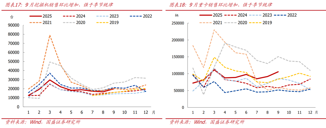 挖掘机、重卡销售环比增加,同比增幅扩大。9月挖掘机销量1.99万台,环比8月上升20.2%,强于近年同期均值(2019-2024年同期均值为回升14.0%),同比增幅扩大至25.4%。其中:国内销售0.92万台,环比8月上升20.4%,同比增21.5%。9月重卡销量10.56万辆,环比8月上升15.2%,强于近年同期均值(2019-2024年同期均值为回升11.7%),同比增幅扩大至82.9%。