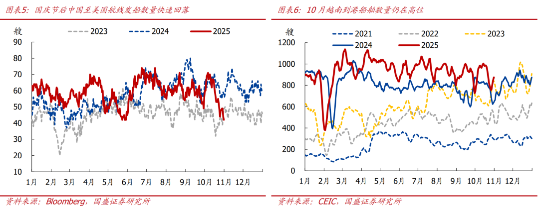 10月对美出口同比降幅可能仍大,与美国征收对华港务费等扰动有关。由于船舶调度需要时间,实际发船数量滞后集装箱预定量两周左右,Vizion数据显示,9月中旬至10月中旬中国至美国航线的集装箱预定量同比增速为-11.3%,对应10月我国对美出口仍偏弱;彭博数据显示,国庆节后中国对美集装箱船发船数量大幅回落,目前处在历史低位。