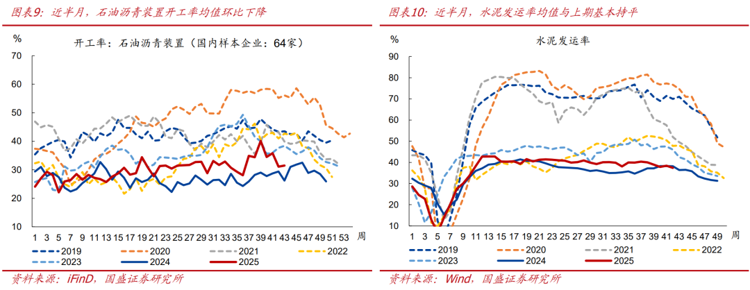 上游看,高炉、焦化企业开工率下降,可能与反内卷有关;沥青开工率下降,水泥发运率持平前值,基建实物工作量未有明显改善。近半月来,全国247家样本高炉开工率均值环比回落1.0个百分点至83.2%,相比2024年、2019年同期分别偏高0.9、5.9个百分点。焦化企业开工率均值环比回落1.8个百分点至68.8%,相比2024年同期偏高0.2个百分点,相比2019年同期偏低4.5个百分点。石油沥青装置开工率均值环比回落3.9个百分点至31.3%,环比弱于近年同期均值(2019-2024年同期均值为降1个百分点),相比2024年同期偏高3.5个百分点、相比2019年同期偏低12.1个百分点。水泥发运率均值与上期基本持平,相比2024年、2019年同期分别偏低0.3、32.8个百分点。