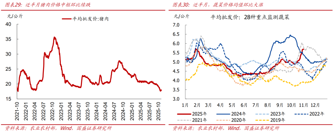 下游消费品:猪肉价格环比下跌,蔬菜价格环比上涨。近半月来,猪肉价格均值环比下跌3.3%至约17.8元/公斤,同比跌幅扩大至27.8%。降温降雨天气导致蔬菜生产供应收紧,蔬菜价格环比上涨9.4%,强于季节规律(2017-2024年同期均值为降1.2%),同比跌幅收窄至1.1%。