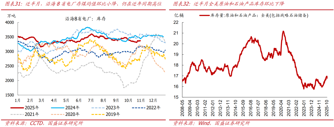 沿海8省电厂存煤环比小降,仍在近年同期高位;全美原油及石油产品库存下降。近半月来,沿海8省电厂存煤均值环比下降0.3%,绝对值仍在近年同期高位,同比下降4.4%、相比2019年同期偏高22.6%。截至2025年10月24日,全美原油及石油产品库存环比下降1872.3万桶,绝对值回升至16.78亿桶。
