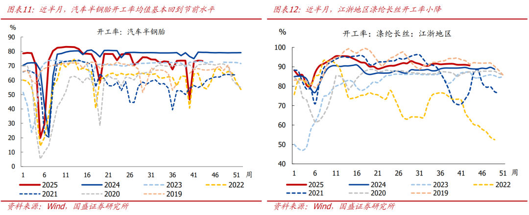 汽车半钢胎开工率基本回到国庆节前水平,涤纶长丝开工率小幅回落。近半月来,汽车半钢胎开工率均值环比回升13.9个百分点至73.5%,基本回到国庆节前水平,相比2024年同期偏低5.9个百分点、相比2019年同期仍然偏高5.9个百分点。江浙地区涤纶长丝开工均值环比回落0.2个百分点至90.9%,仍为近年同期次高,相比2024年同期偏高1.5个百分点,相比2019年同期偏低1.4个百分点。