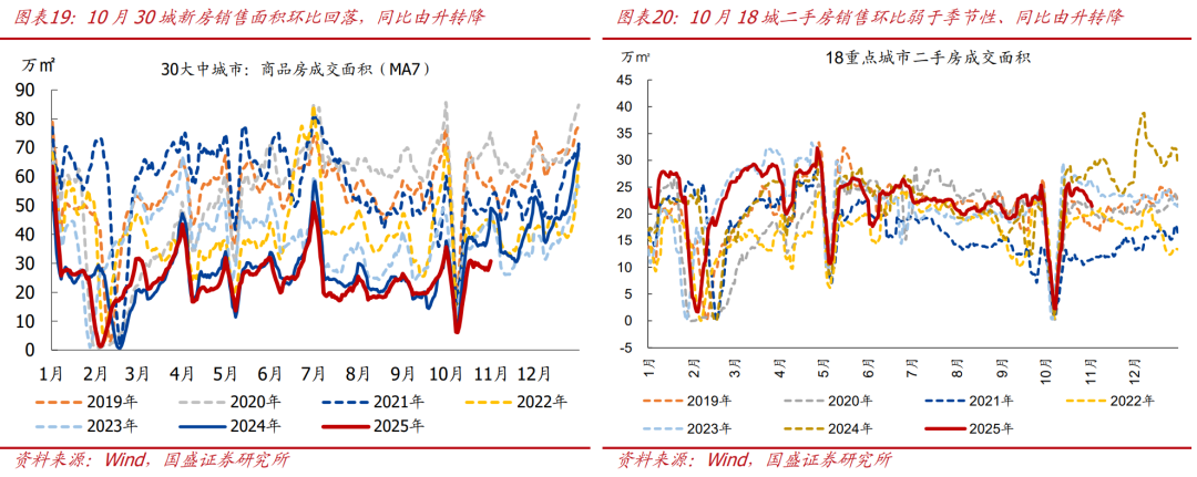 10月30城新房成交环比小降,同比回落34个百分点至-27.3%。10月30大中城市商品房日均成交面积录得23.7万㎡,创近年同期新低,环比9月均值下降3.3%,同比下降27.3%(9月同比增6.7%);其中:近半月看,30大中城市新房日均成交面积季节性回升,环比增28.0%,绝对值同样创近年同期新低,同比降29.7%。