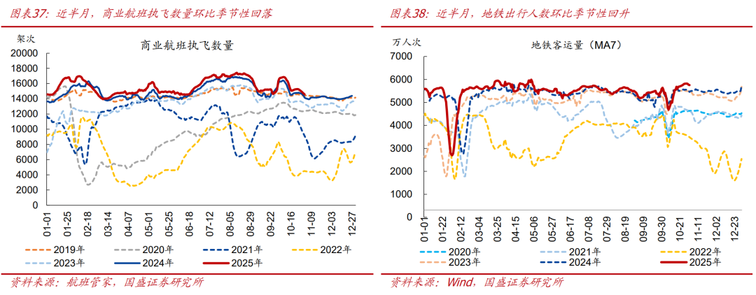 >人员流动:近半月,商业航班执飞数量均值环比季节性回落5.4%,10个重点城市地铁客运人数环比季节性回升8.6%,绝对值均为近年同期最高。
