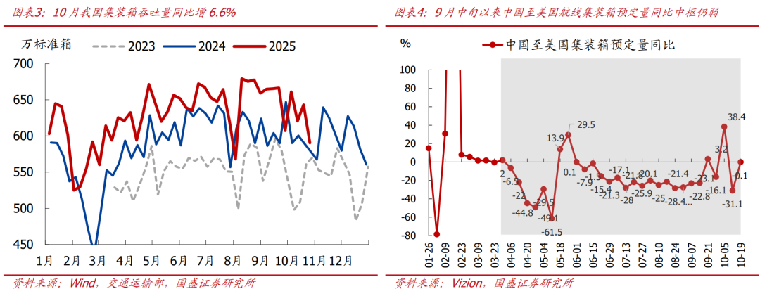 1)整体看:10月我国集装箱吞吐量同比增6.6%(前值7.3%),仍有韧性。