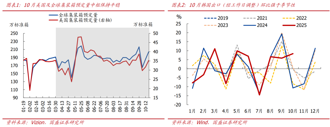 全球看,10月韩国出口(经工作日调整后)强于季节性,全球贸易平稳增长