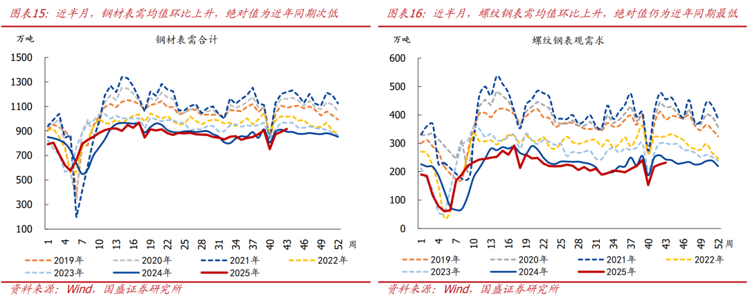 钢材、螺纹钢表需环比季节性回升,绝对值仍在近年同期低位。近半月,钢材表观需求均值环比回升11.4%至约904.6万吨,略弱于季节规律(2019-2024年同期环比均值为14.3%),绝对值为近年同期次低(仅高于2024年同期),同比增0.2%,相比2019年同期偏低17.6%。其中:螺纹钢表需均值环比回升23.6%至约229.1万吨,略弱于季节规律(2019-2024年同期环比均值为24.9%),绝对值仍为近年同期最低,同比降8.6%,相比2019年同期偏低42.4%。