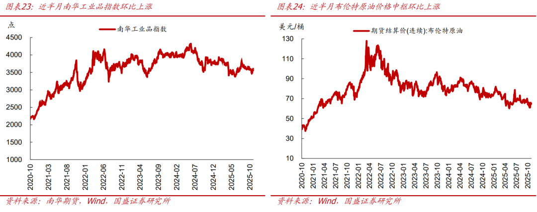 >能源:沿海8省电厂存煤均值环比下降0.3%,绝对值仍在近年同期高位,同比下降4.4%。截至2025年10月24日,全美原油及石油产品库存环比下降1872.3万桶,绝对值回升至16.78亿桶。