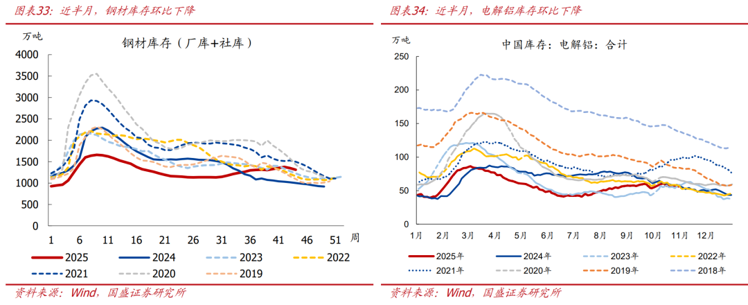 钢材、电解铝库存均下降。近半月来,钢材库存环比下降4.7%,同比增加31.1%。电解铝库存环比下降3.2%、绝对值仍为近年同期次低(仅高于2023年同期),同比下降1.8%。