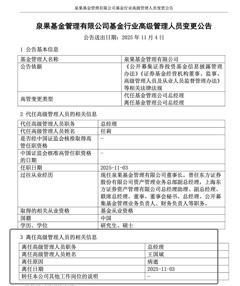 11月3日,泉果基金发布高级管理人员变更公告,公司董事长任莉代任总经理,原总经理王国斌因病逝世。