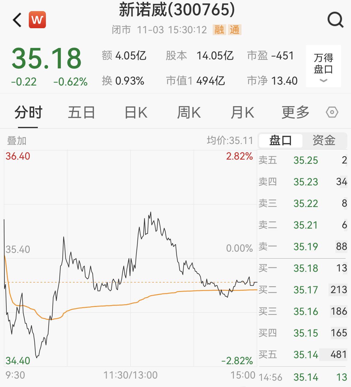 二级市场方面,11月3日,新诺威股价高开低走,盘中最大跌幅2.82%,收盘跌0.62%,报35.18元/股,总市值494亿元。