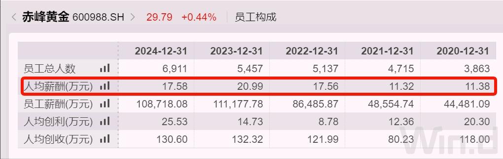截至2024年末,赤峰黄金职工总数6900余人,增加约1500人,去年人均创利25.5万元,增加超过10万元;人均税前薪酬17.6万元,比2023年减少3.4万元。