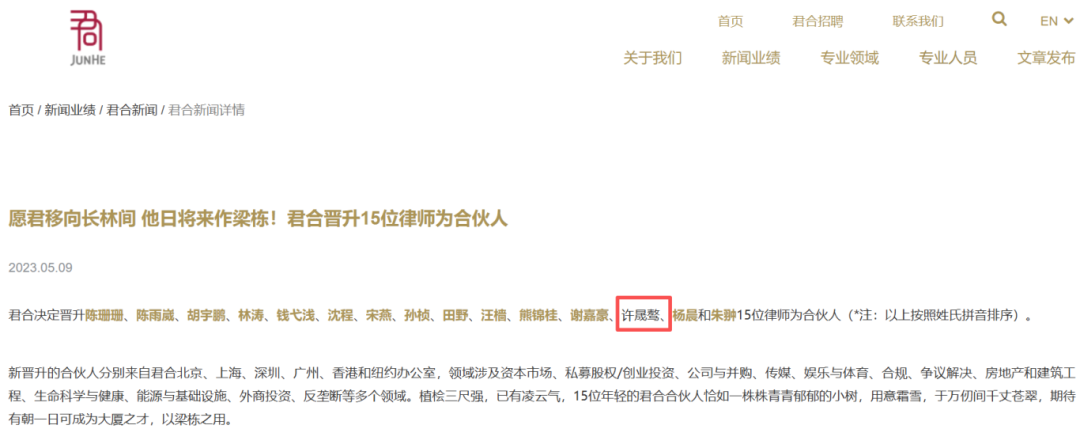 公开资料显示,许晟骜于2015年8月加入君合,2023年5月晋升为合伙人。