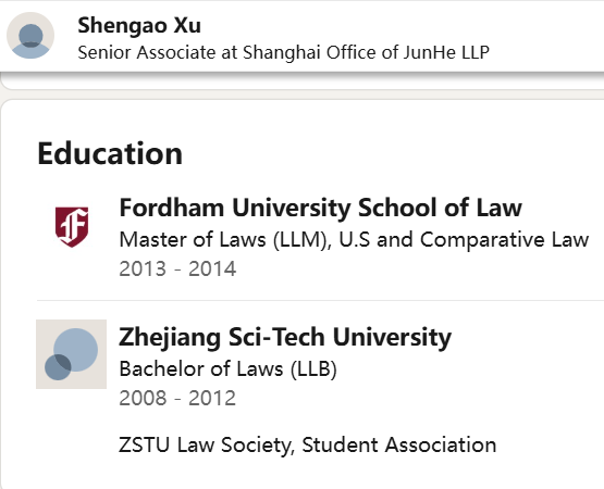 据领英信息,许晟骜2008年至2012年就读于浙江理工大学法学专业,随后赴美国福特汉姆大学攻读法学硕士,具备中国律师资格和美国纽约州律师资格。