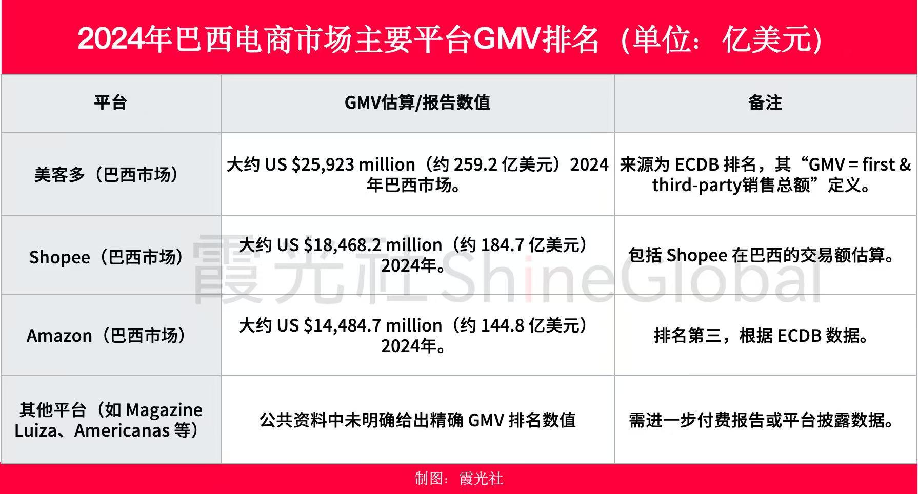 仅就电商研究机构ECDB提供的巴西各大电商公司2024年的GMV排名来看,美客多仍然牢牢占据巴西电商的主要份额,凭借完善的生态体系和服务,涵盖电商平台、金融支付(Mercado Pago)和流媒体(Mercado Play)等业务板块,美客多早已渗透到巴西8千万用户的日常生活,而美客多目前正在面对中国电商企业的挑战。