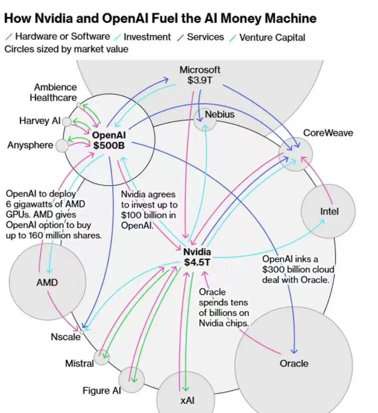 这种大而不能倒体现在好几个方面。首先是英伟达,这个被认为在人工智能热潮里唯一赚得盆满钵满的企业,最近一段时间不仅投资了OpenAI,还投资了多个GPU租赁企业,说白了就是拿英伟达自己的钱,让其他人去买自己的GPU。