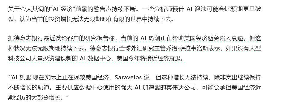 当然,发展中有泡沫是正常的,00年代的互联网泡沫不影响后续的互联网发展。但是当下美国经济完全依赖人工智能,经济基本面远不如00年,甚至不如08年;一旦出什么问题,情况就非常糟糕了,甚至有可能导致全球经济的巨大动荡。