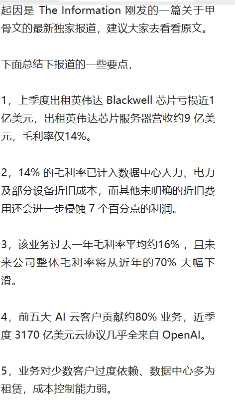 我们依然回到甲骨文的股价。在10月7日,甲骨文的股价出现了一次很大规模的调整,理由在于市场意识到了,甲骨文的人工智能业务可能并没有那么赚钱,而如果考虑硬件折旧,情况可能更糟,因为英伟达更新换代的速度太快,折旧的成本还要大幅度增长,人工智能数据中心的有效寿命只有3-8年,然后就会因为落后被淘汰,寿命远低于传统数据中心。