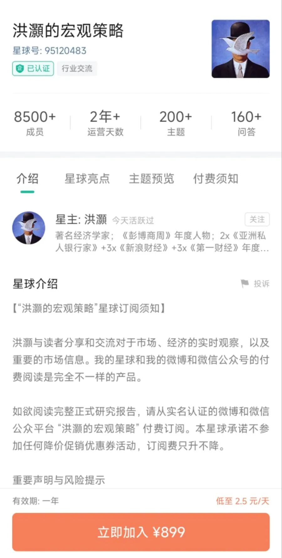 知名经济学家刘煜辉是较为早期的实践者之一。其知识星球运营时间已超7年,内容以宏观经济和趋势分析观点为主。截至目前,该星球已吸引了超过9900位用户付费加入,当前定价为488元/年。公开资料显示,刘煜辉曾先后担任华泰证券、广发证券和天风证券的首席经济学家。