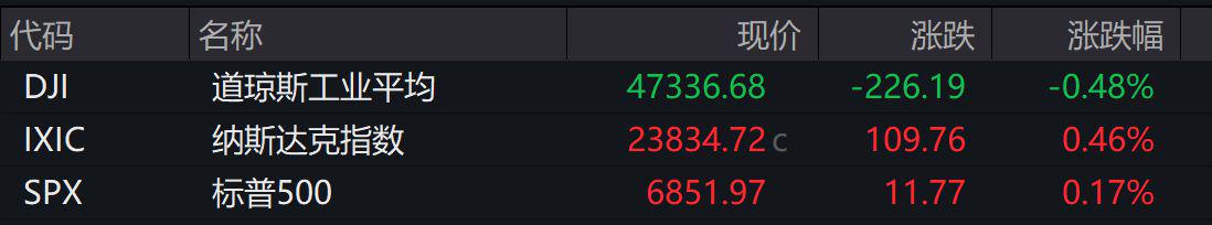 美东时间11月3日16:00(北京时间11月4日5:00),道指收跌226.19点,报47336.68点,跌幅为0.48%;纳指收涨109.76点,报23834.72点,涨幅为0.46%;标普500指数收涨11.77点,报6851.97点,涨幅为0.17%。