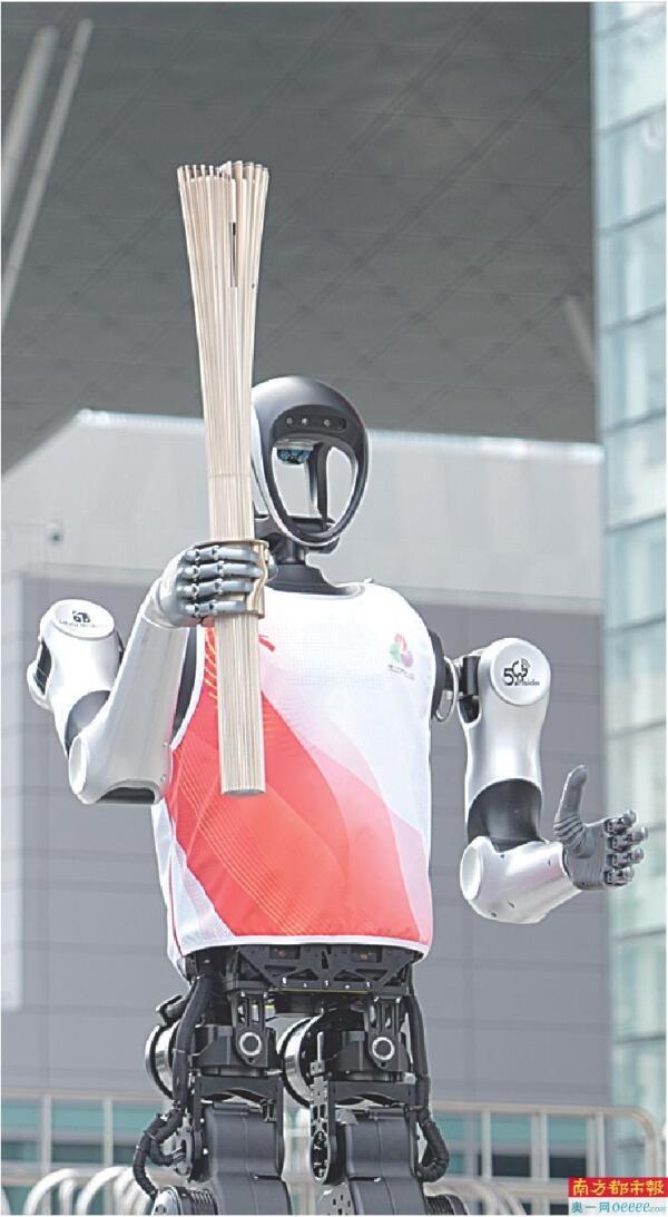 乐聚机器人打造的全球首个5G-A人形机器人火炬手“夸父”亮相十五运火炬传递仪式。