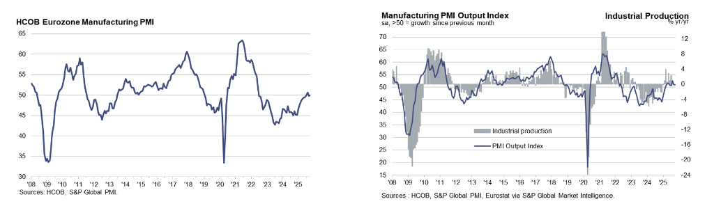 欧元区制造业在10月份陷入停滞,PMI恰好落在荣枯分界线上。尽管产出连续第八个月微弱扩张,但持平的新订单、持续萎缩的出口以及加速的裁员步伐,共同揭示了行业复苏的脆弱性。