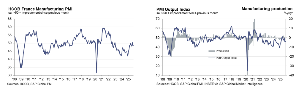 法国10月份PMI指数录得48.8。核心在于需求的持续疲软,尤其是来自本土市场的拖累。受访企业将订单下滑归咎于国内政治局势的不确定性,以及由此引发的客户支出犹豫。更值得警惕的是,制造商对未来12个月的产出预期已转为负面,这是近十个月来的首次。