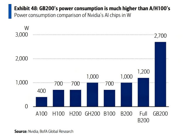 高性能芯片的部署:以英伟达(NVIDIA)为例,其GB200芯片的功耗高达2.7kW,远超H100的700W。