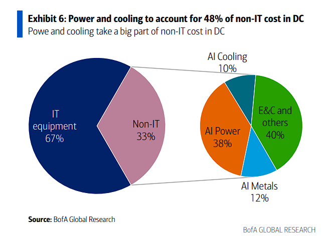 在这一背景下,美银预计到2030年,中国AI总投资将达到约2-2.5万亿元,而重点关注的8000亿元非IT基础设施投资中,电力系统(发电和输电)将占据38%的绝对主导地位,其次是数据中心建设所需金属(12%)和先进冷却系统(10%)