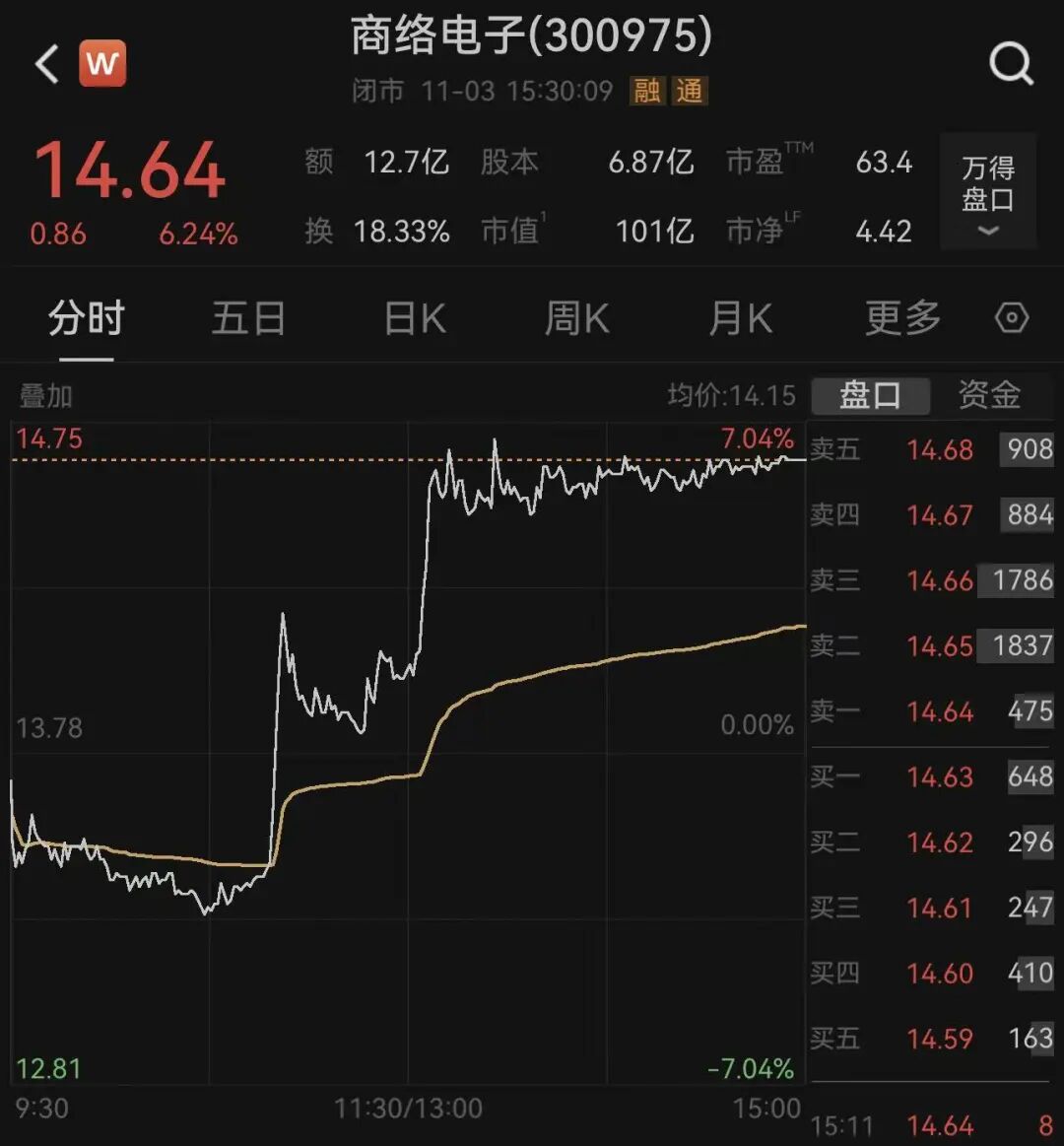 二级市场上,截至11月3日收盘,商络电子股价,涨6.24%,报14.64元,最新市值为101亿元。