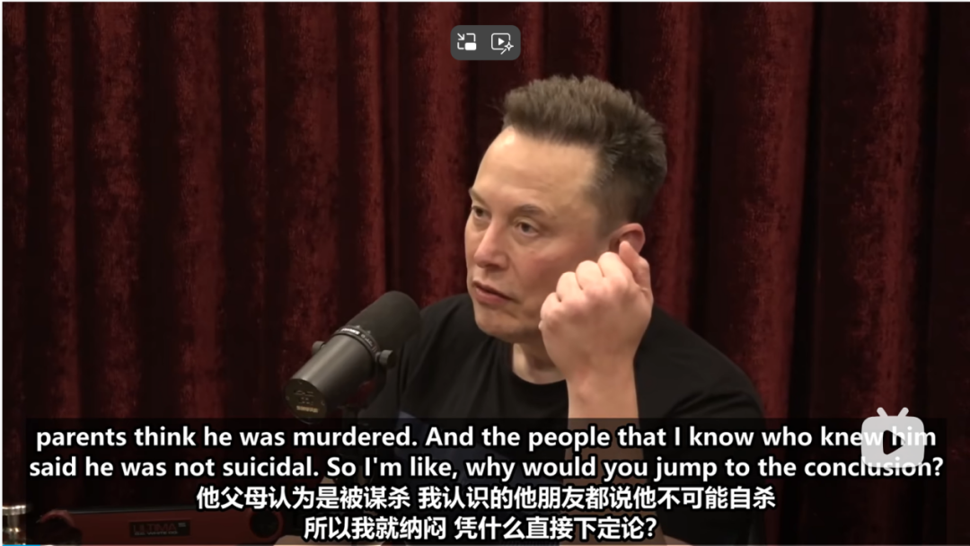 其父母对自杀结论存疑,2025年2月提起诉讼质疑法医报告。马斯克曾公开评论此案,此次在节目里又再次质疑了调查结果。