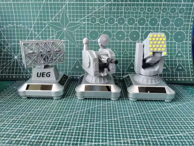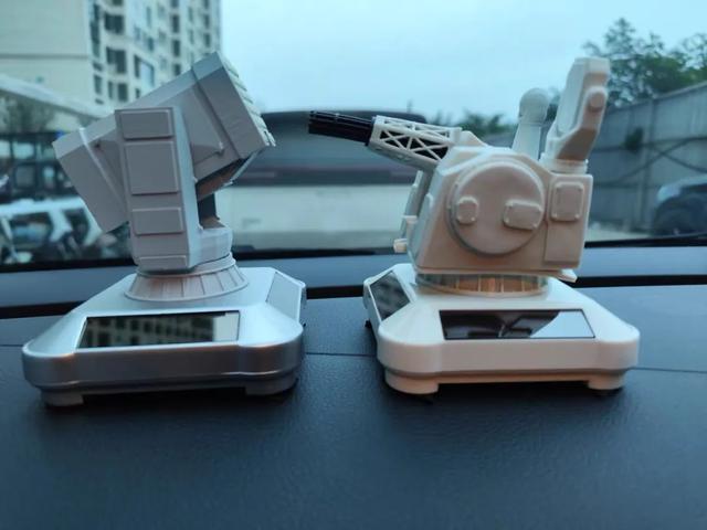 原来,翁迪对模型进行了改装。原版的近防炮并没有底座,为了让它能在汽车上稳固地旋转,他手动为模型增加了一个太阳能底座,并配上了方便粘贴的工具。