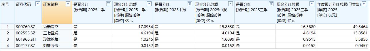 值得关注的是,迈瑞医疗、三七互娱、玲珑轮胎、御银股份2025年一季报、半年报、三季报均宣布分红。其中,迈瑞医疗年内宣告分红总额达49.35亿元。